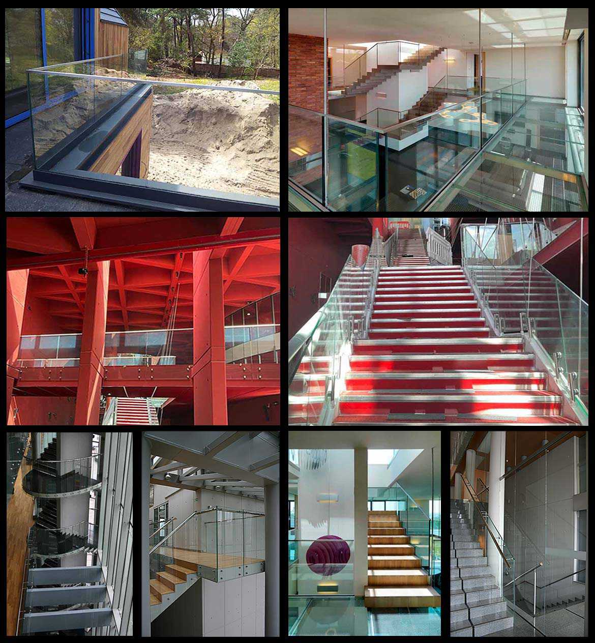 Gepresenteerde oplossingen zijn van roestvrij of gegalvaniseerd staal en vullig van gelaagd, veiligheidsglas.